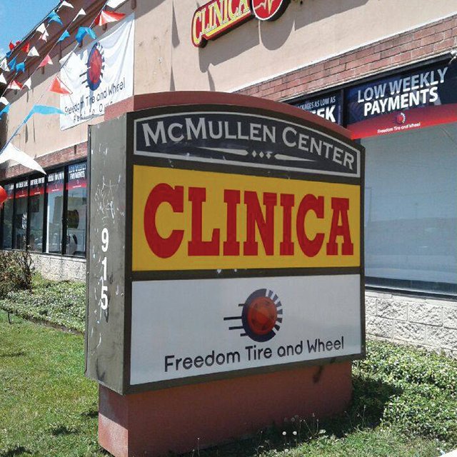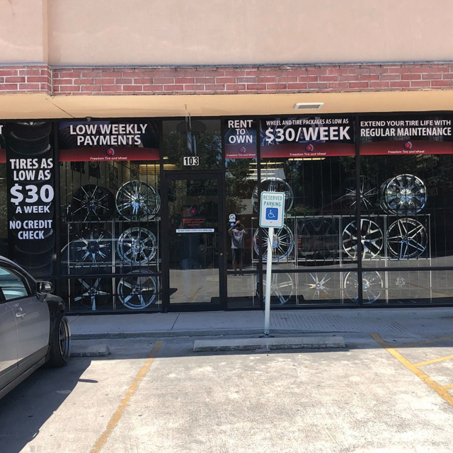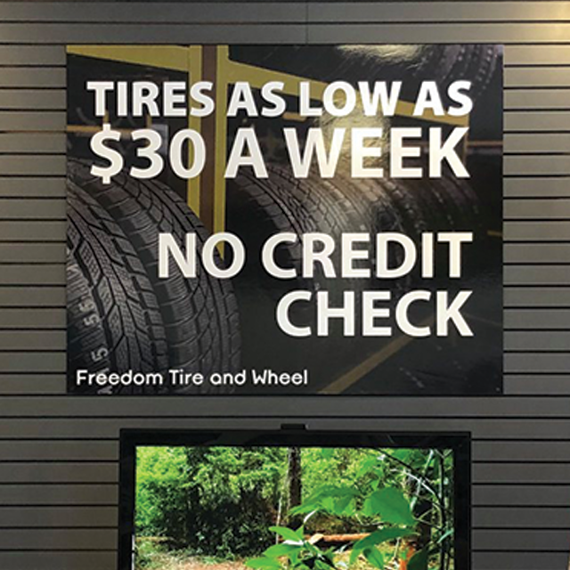 A storefront series featuring window perf and a hanging sign.